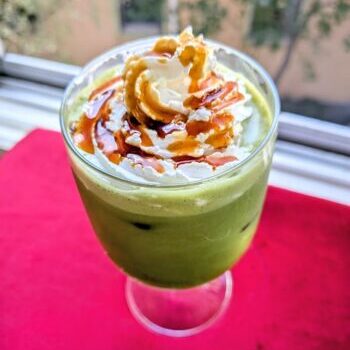 抹茶好きにはたまらない抹茶ラテ。クリームの上の黒蜜が甘くて美味しいです。